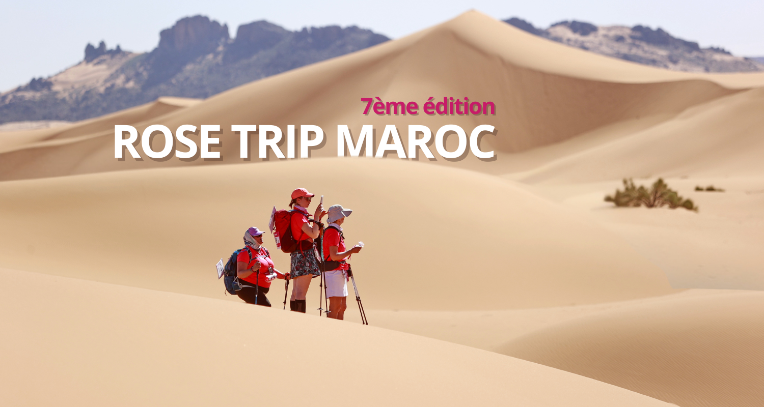 Organisée à la fin du mois d’Octobre Rose, le Rose Trip Maroc s’inscrit dans une dynamique de solidarité en soutenant les associations Jeune & Rose et Ruban Rose, engagées dans la lutte contre le cancer du sein. Le trek collabore également avec les associations Enfants du Désert (pour l’émancipation et l’autonomie des femmes); Fillactive (pour l’autonomisation des femmes à travers l’éducation et l’action environnementale) et Surfrider Foundation Maroc (pour la préservation de l’environnement).